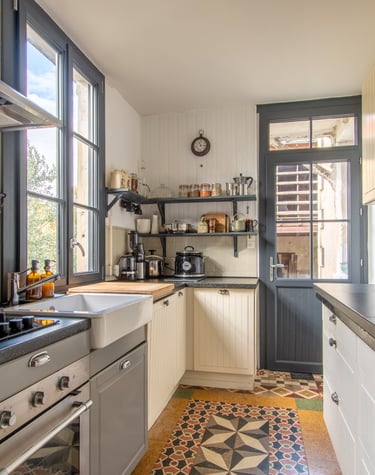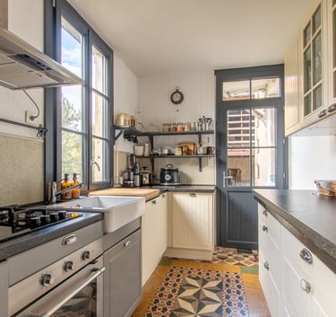 Dotée de 3 salles de bains avec wc ; la maison comporte deux salons-salles à manger , deux terrasses , et une cuisine équipée de plaques de cuisson, four , vaisselle et couverts, ainsi qu'une machine à café à capsules, une machine à café (avec broyeur et 12 boissons différentes), théière, un four micro-ondes et un réfrigérateur-congélateur, lave vaisselle et lave linge.